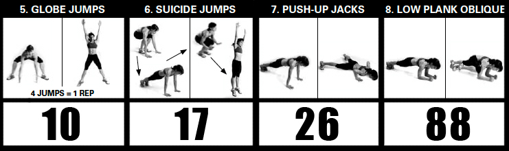 I am truly shocked as to how far I’ve come in such a short amount of time. I might conduct a test on a rest day to see if I can do more Globe Jumps, Suicide Jumps and Push-Up Jacks if do them right after the warm-up. I’m pretty sure I can and it’s just that I’m so tired from the Switch Kicks and Power Jacks to give it my complete all.