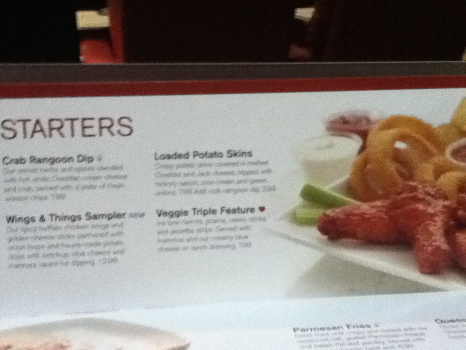 The menu includes a variety of items from starters (buffalo wings and onions rings) to entrees (pasta, burgers and quesadillas) as well as dessert, alcoholic beverages and all over your standard movie concessions (popcorn and candy).