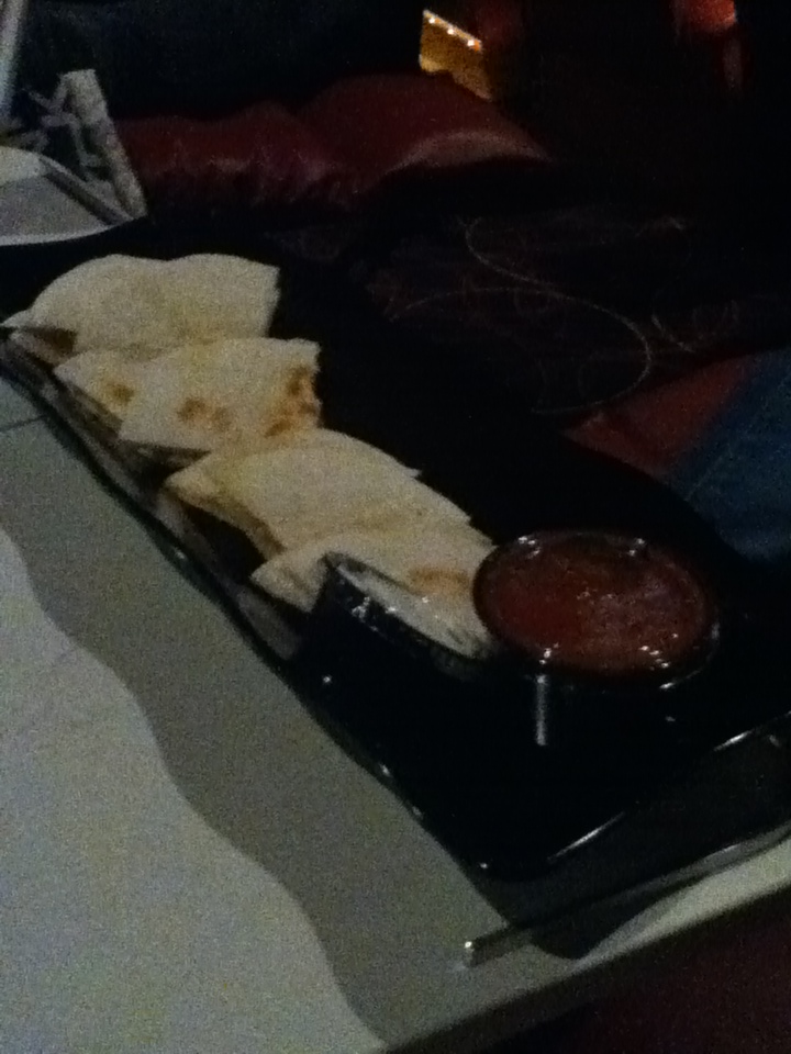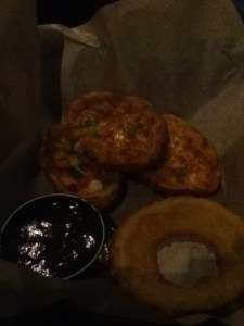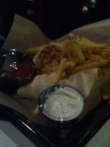 We ordered onion rings and loaded potato skins to share and I ordered the Chicken Fajita Wrap as my entree. The onion rings were really good but the potato skins were way to greasy to me and I couldn’t eat them. The wrap was good but there was a lot of cheese on it, so after a few bites I was satisfied and finished.