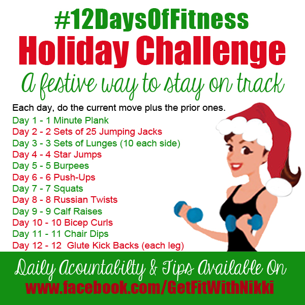With this in mind, I decided it would be fun to run a #12DaysOfFitness Challenge over on the Facebook Page! The graphic below has the list of moves, as well as how many reps should be done each day. The challenge will work as a progression each day, so you will complete the activity of the day PLUS all of the prior ones…just like the Twelve Days of Christmas song. Kinda fun, right?