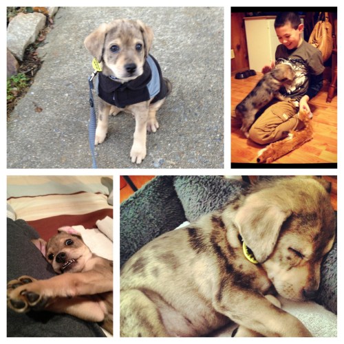 Sorry I’ve been MIA lately, but things always tend to get hectic around this time of year. Being as I am a cake decorator and the hubs is a letter carrier, the holidays spark an increase in hours for both of us. It also seems that we have both been doing some hardcore drugs, cause we decided our family needed a new puppy. Yes, you read that correctly, a new puppy. I blame the show “Too Cute” which airs on Animal Planet. I also blame the convenient timing of the pet adoption at Petsmart, which just happened to be going on the day after I watched a “Too Cute” marathon AND the fact that I happened to have my son out running errands with us. You see, a puppy is something he has been begging us for. Without further delay, I introduce you to our little bundle of fur, cuteness and pointy little fangs…